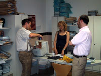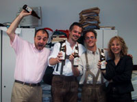 17/06/02 montag bis einschließlich donnerstag vergangener woche standen unter dem zeichen der hausarbeit. die letzte nacht haben wir natürlich wieder durchgeschrieben - donnerstag morgen um neun, also immerhin satte drei stunden vor der abgabe hatten wir unsere meisterwerke druckfrisch in händen. wie man sieht waren unsere lehrer von lederhosen und weißbier begeistert. |